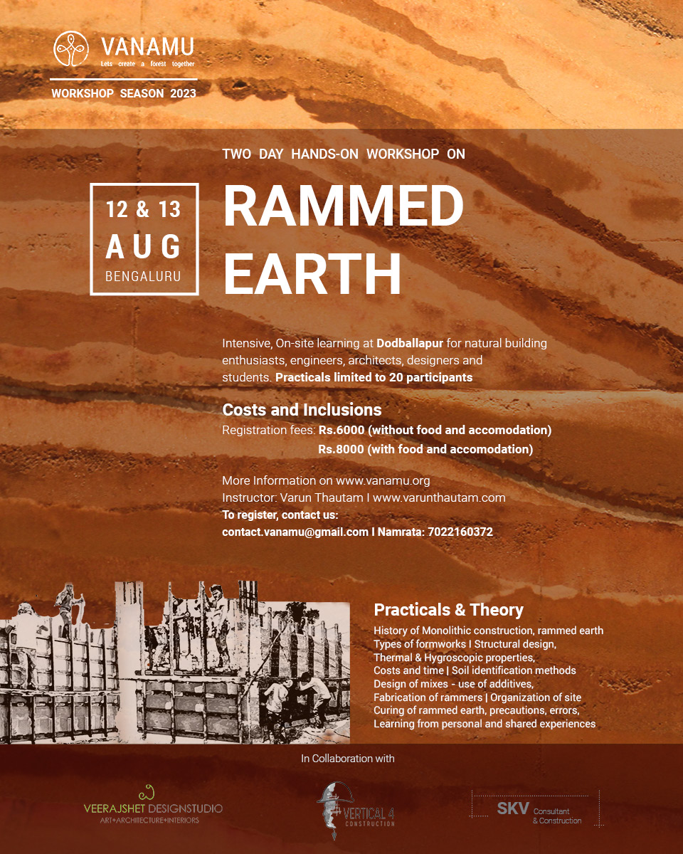 History of Monolithic construction, aspects of design | History of rammed earth | Types of formworks and its relation to built form | Design guidelines | Structural design | Rammed earth foundations | Details of joints with various materials and components | Thermal properties, density, and thickness selection | Hygroscopic properties and humidity buffering potential | Costs and time | Codes of practice and normativity | Soil identification methods | Soil stabilization Methods | Selection of materials | Texture, porosity, and durability| Design of mixes – use of additives | Designs, and fabrication of modern formworks | Fabrication of rammers | Organization of site | Curing of rammed earth, precautions | Errors, and learning from personal and shared experiences | Rectification and maintenance.